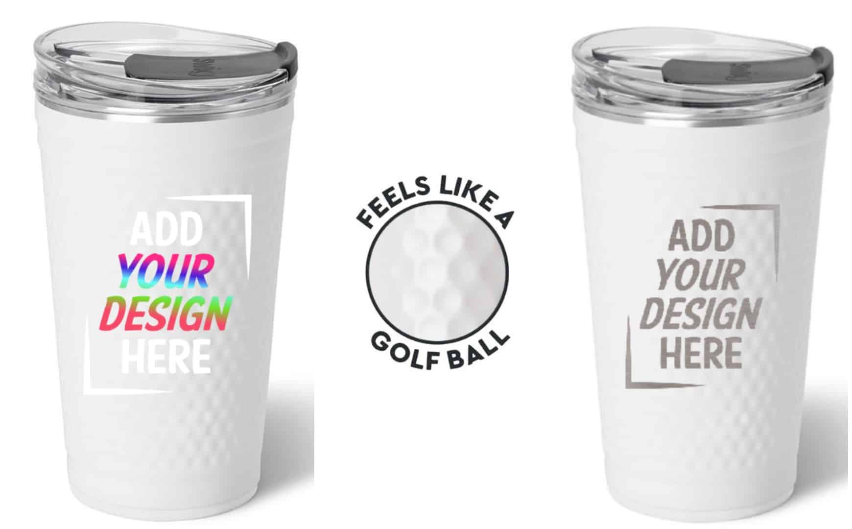 SwigLife Golf Ball Party Cup holds up to 24 Oz. and keeps drinks cold 12+ hours and hot 3+ hours. It can be stacked together, fits most standard cup holders, double-walled, vacuum-sealed, and copper-plated, condensation-free and non-breakable, constructed of 304-18/8 stainless steel, built-in silicone coaster base prevents slips, drips, and scratches, and includes an X-Large EZ Slider Lid with removable slider. When holding the cup it feels like the dimples of a golf ball. 6 3/4″ H x 3 3/4″ W